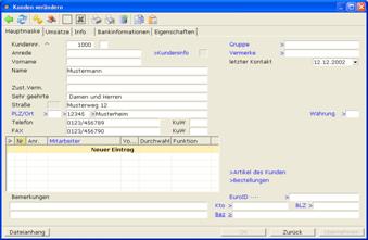 Wenn Sie in Auswahllisten mit der Taste Eingabe einen Datensatz aufrufen, öffnet sich die Eingabemaske. Entsprechend einer Karteikarte zeigt die Maske alle Informationen eines Datensatzes. Jede Information ist in einem Feld abgelegt, neben- und untereinander angeordnet sind. Vor oder über einem Feld steht die Feldbezeichnung. Das Aussehen der Maske ist je nach Kartei verschieden. Im oberen Rahmen der Maske wird der Name der Kartei und der Bearbeitungsmodus angezeigt.