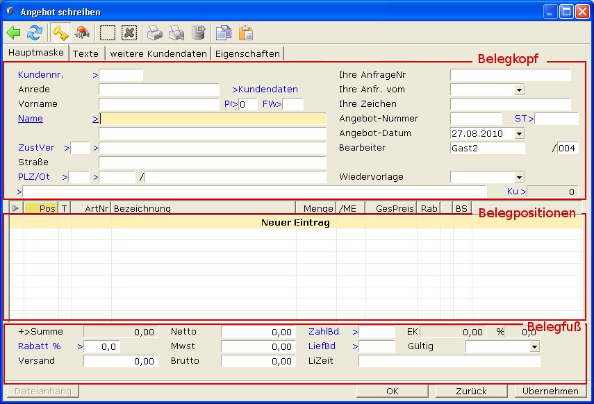 Im folgenden ist der Aufbau der Belegmaske und die Neuanlage eines Belegs beschrieben. Das Beschriebene gilt bis auf wenige Ausnahmen für alle Belegarten, auch für die Einkaufsbelege (Ausnahme ist z.B. die Preisbildung).