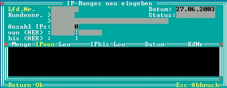 Nachdem Sie die die Lfd.Nr. vergeben (Einf. drücken) und die Kundendaten aufgenommen haben, geben Sie die Menge der Adressen vor. Danach vergeben Sie die Startadresse. Adressen kleiner 100000 werden mit führenden Nullen aufgefüllt. Danach betätigen Sie F2, um die Berechnung der Endadresse und das Speichern der Range zu veranlassen.