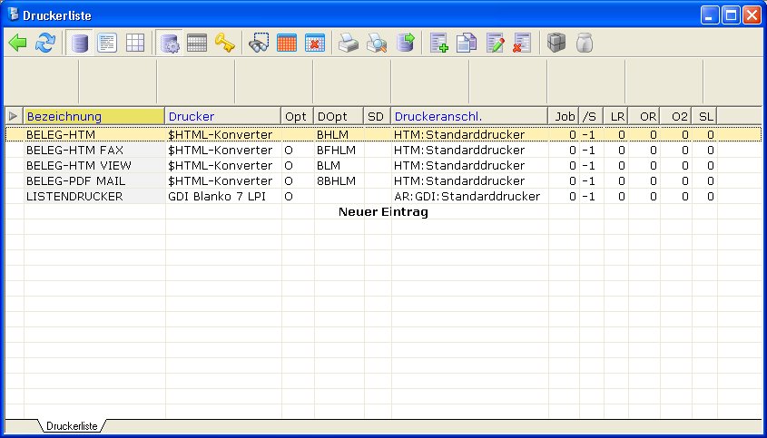 Die Definition der logischen Drucker und deren Konfiguration erfolgt in der Druckerliste (Menü System|Druckerliste). Die Einstellmöglichkeiten sind im Artikel Druckerparameter beschrieben.