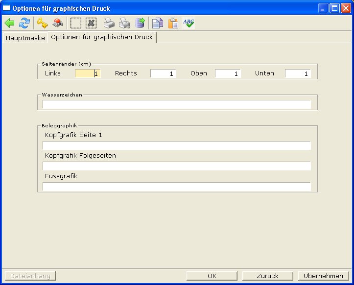 - Beleggrafik In diesen Feldern können Sie alternative Beleggrafiken eintragen. Die Grafiken sollten im Verzeichnis image liegen. Sie können den Pfad relativ oder absolut angeben. Sie dürfen keine UNC Pfadangabe verwenden. Dieser Drucker darf nicht in die Verbindungsliste verweisen (Feld Stationsdrucker muss leer sein). Z.B.: image/grafik01.png. Sind die Felder leer werden die Grafiken verwendet, die in der Parametermaske 15 eingetragen sind.