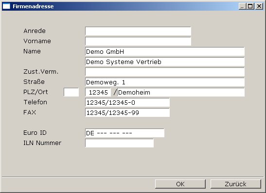 Geben Sie in dieser Maske Ihre Adresse und die Umsatzsteuer Identifikationsnummer (EuroID, U.ID) an. Die Telefonnummer, Faxnummer und EuroID wird auf jedem Beleg (z.B. Rechnung) ausgedruckt. Die übrigen Adressangaben werden auf den Vordrucken mancher Zusatzmodule verwendet, z.B. beim Drucken der Umsatzsteuervoranmeldung mit der IFW FIBU. (Voraussetzung ist die Verwendung der Standarddruckvorlagen *.dvl)