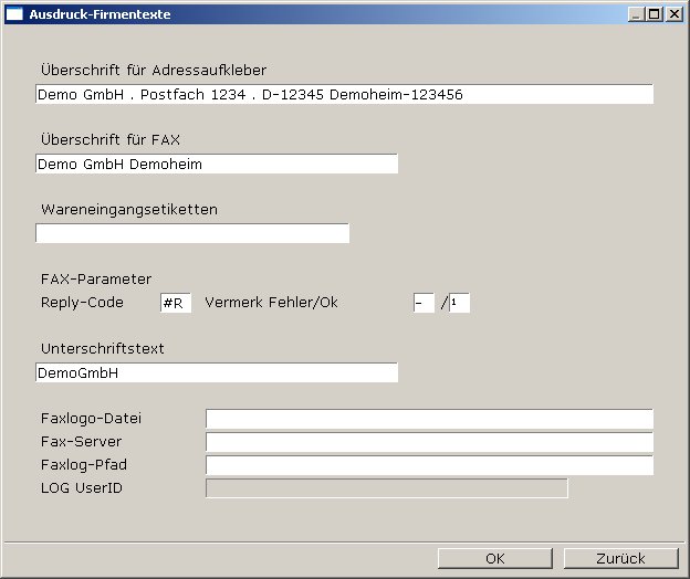 Die anderen Felder werden in der aktuellen IFW Version nicht mehr benötigt. Etiketten und Faxdruck erfolgen in der aktuellen Version auf andere Weise, so dass diese Informationen nicht mehr benötigt werden. Lassen Sie die Felder leer.