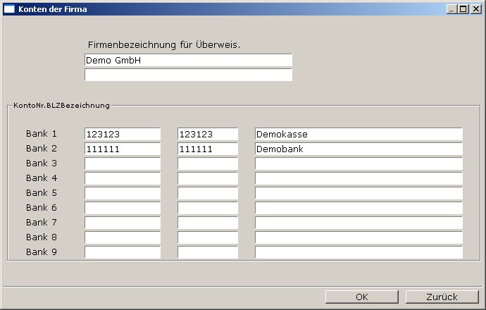 Zum Drucken von Überweisungen muß diese Maske ausgefüllt werden. Mit dem Basissystem wird nur die Bankverbindung1 ausgegeben.