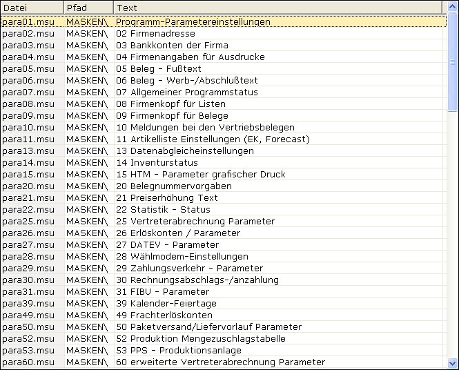 Die Programmparameter enthalten mehrere Masken gleichen Aufbaus für verschiedene Belegtypen, sowie den Fremdsprachen Englisch, Französisch und Italienisch.
