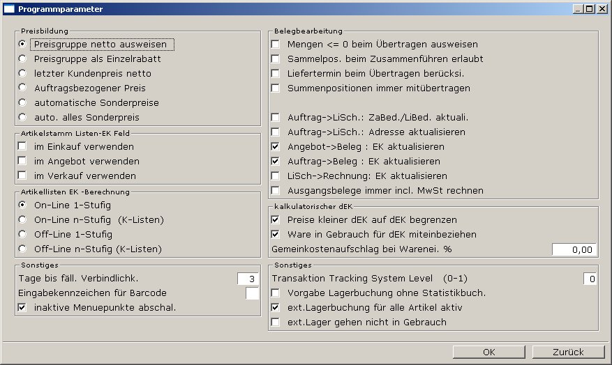 Treffen Sie hier Einstellungen für die Preisausweisung und dem Programmverhalten beim Ableiten von Belegen (z.B. von Lieferschein Rechnung schreiben). Verwenden Sie die Online Hilfe für die Bedeutung der Felder. Graue Einträge sind abgeschaltet, da in Ihrer IFW Version die dazugehörenden Zusatzmodulen nicht vorhanden sind.