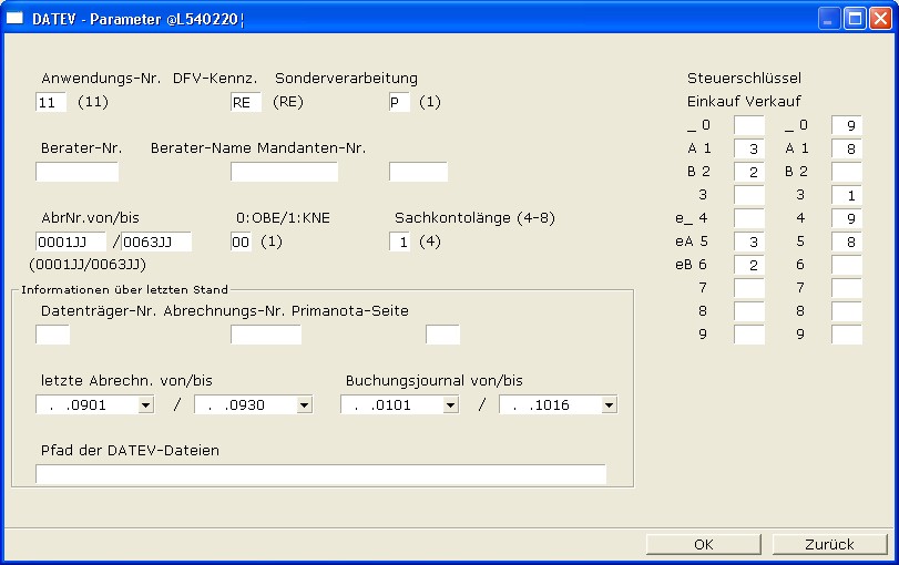 Die Maske ist im Basissystem ohne Funktion. Sie besteht aus Gründen der Kompatibilität und setzt das Modul "FIBU - Schnittstelle" voraus. Lassen Sie die Felder unverändert und beachten Sie die entsprechenden Modulbeschreibungen.
