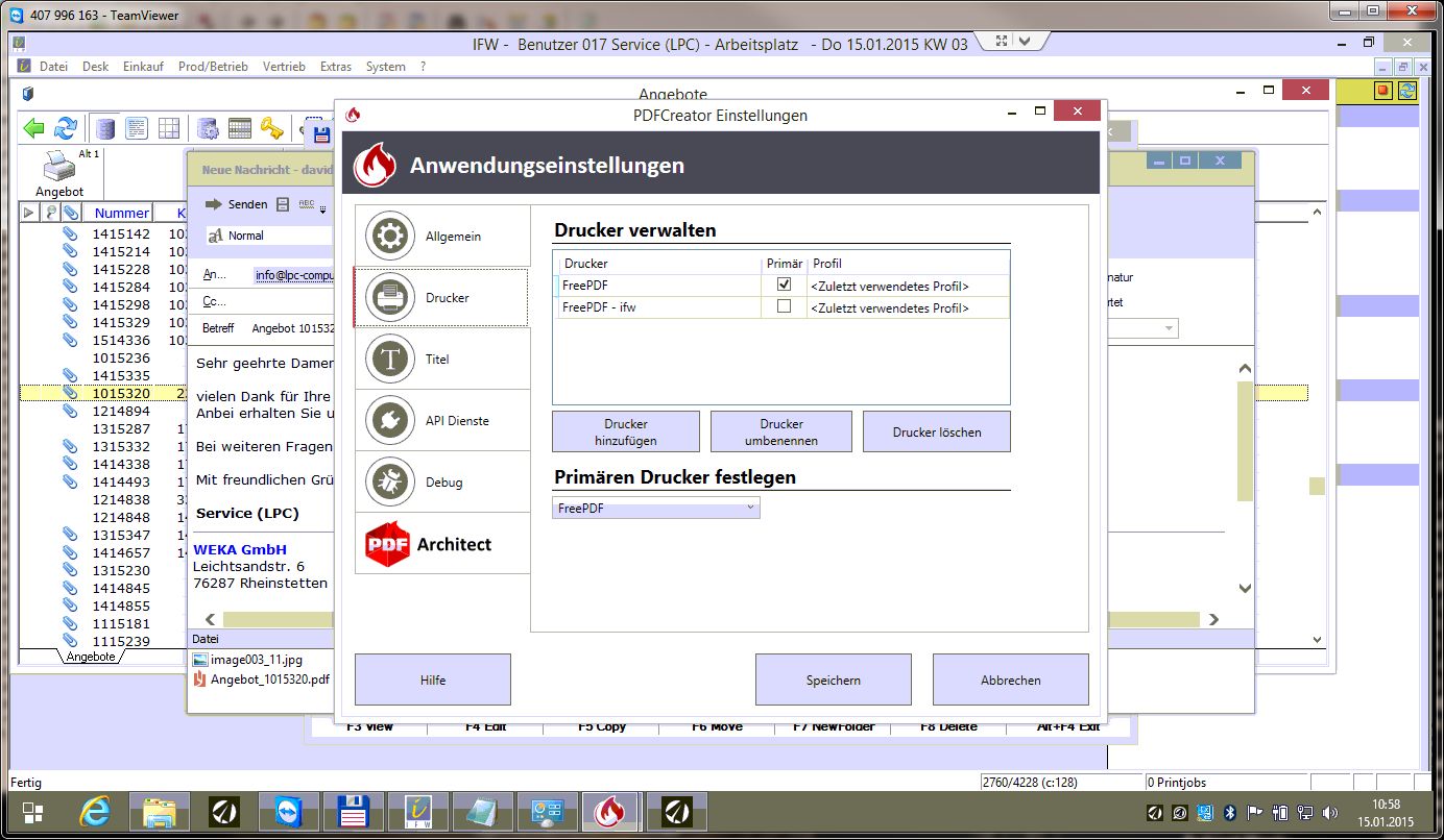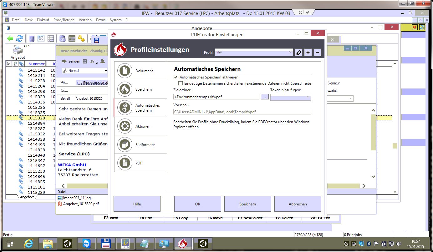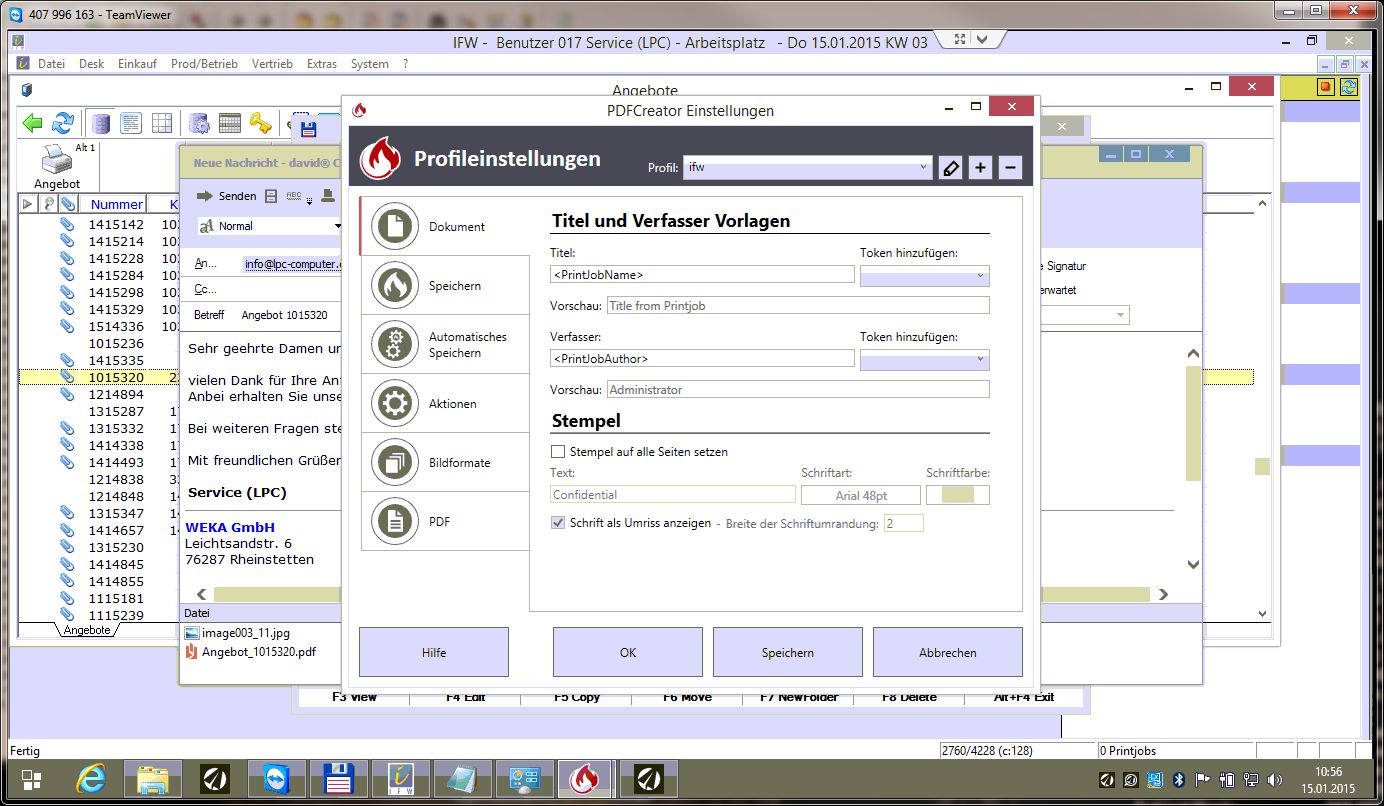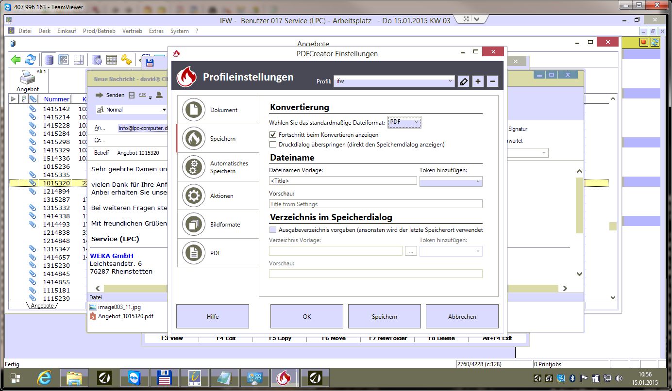 - Der Dateiname wird vom IFW an den Drucker übergeben, z.B. "Angebot_1500082". Der PDF Drucker muss so eingestellt sein, dass er daraus die fertige Datei "Angebot_1500082.pdf" entsteht. Nur dann funktioniert der autom. Emailversand aus dem IFW.