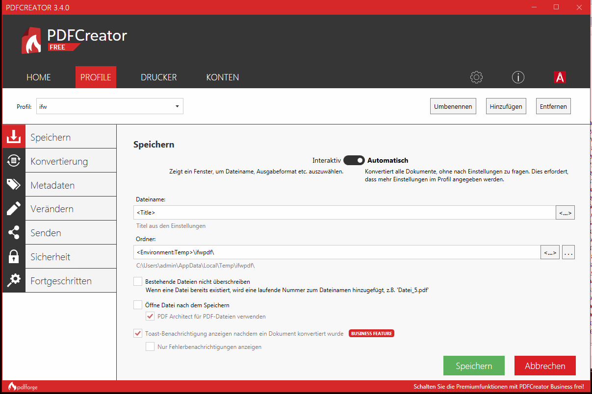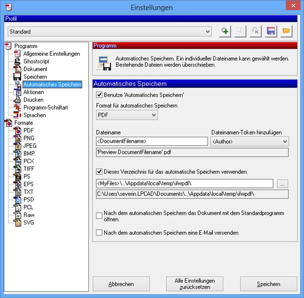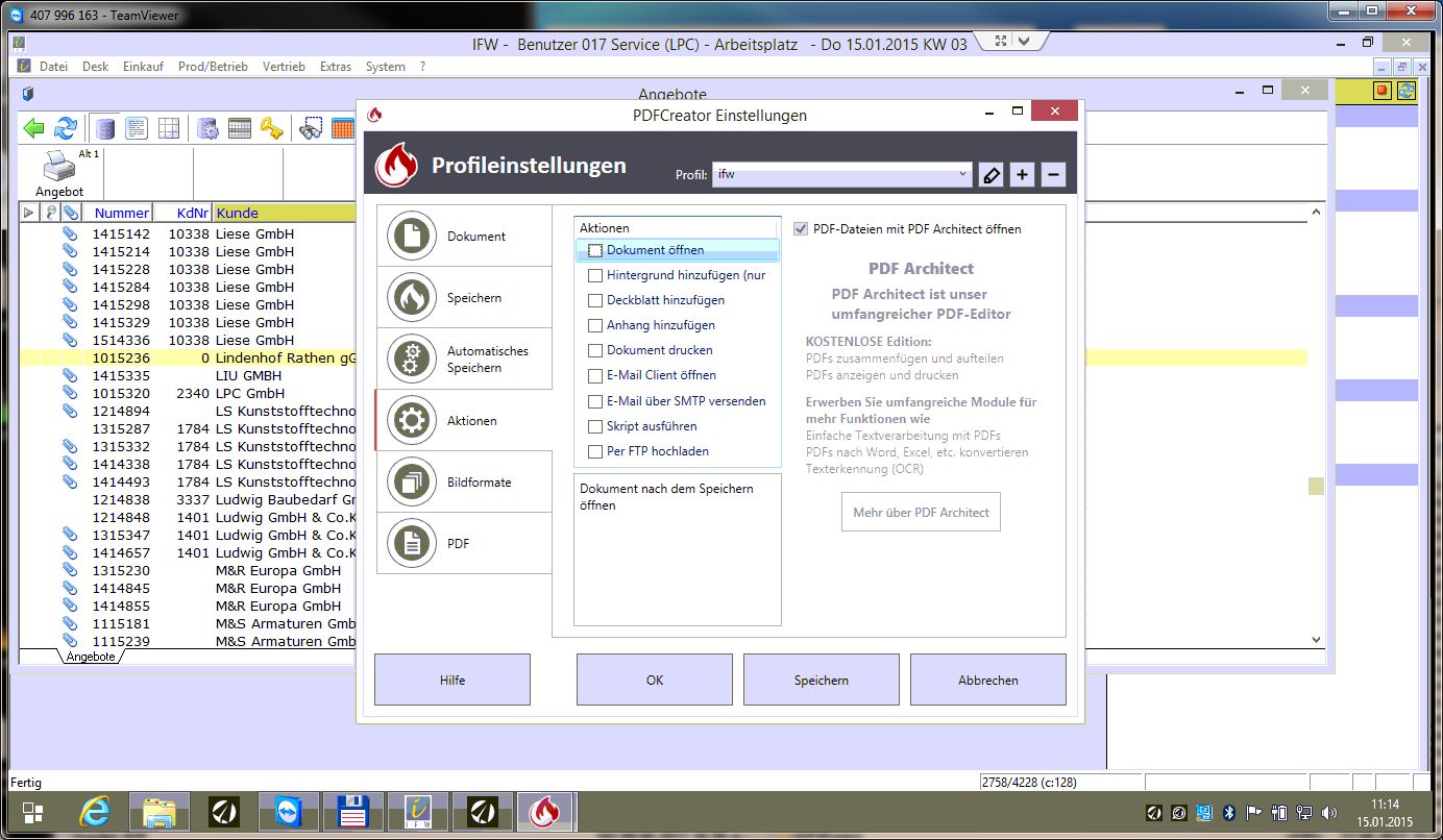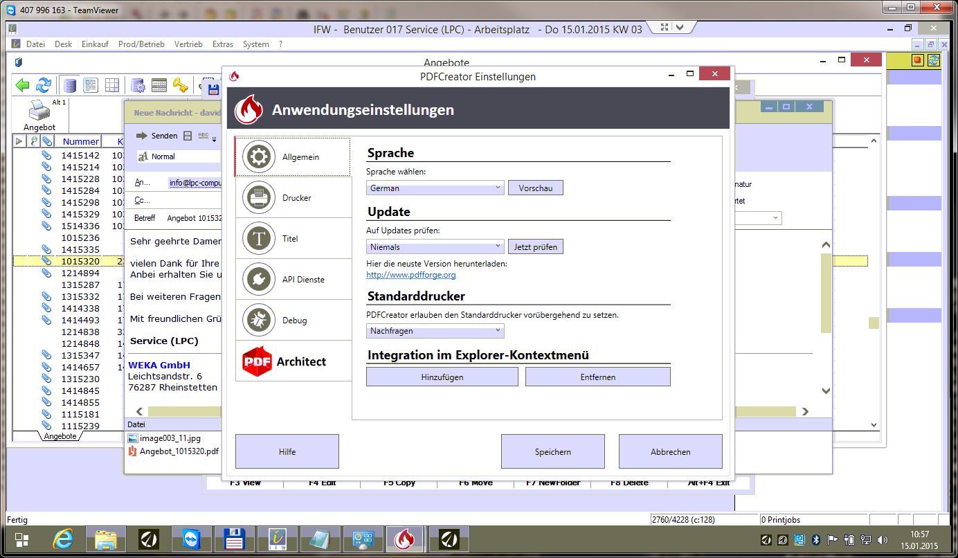 - Der Dateiname wird vom IFW an den Drucker übergeben, z.B. "Angebot_1500082". Der PDF Drucker muss so eingestellt sein, dass er daraus die fertige Datei "Angebot_1500082.pdf" entsteht. Nur dann funktioniert der autom. Emailversand aus dem IFW.