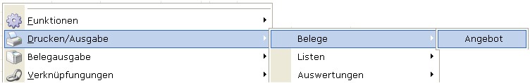 Suchen Sie den gewünschten Beleg und öffnen Sie das Druckmenü (Taste F4 oder Rechtsklick). Wählen Sie Drucken/Ausgabe und dann den am besten passenden Menüpunkt (z.B. "Drucken/Ausgabe | Belege | Angebot". Je nach Einstellung erfolgt der Ausdruck direkt oder es erscheint der Druckrequester. Über den Druckrequester können Sie weitere Optionen wählen.
