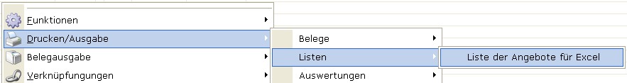 Nachdem Sie die Datensätze markiert haben die auf Ihrer Liste erscheinen sollen öffnen Sie das Druckmenü (Taste F4 oder Rechtsklick). Wählen Sie Drucken / Ausgabe und dann den am besten passenden Menüpunkt (z.B. "Drucken / Ausgabe | Listen | Listen der Angebote für Excel".