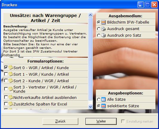 - Unter Ausgabemedium stellen Sie ein, wie der Audsruck erfolgen soll. Benutzen Sie bevorzugt "Bildschirm IFW Tabelle", da die meisten Ausgaben dafür optimiert sind. Sie können dann anschließend immer noch eine Papierausgabe erzeugen.