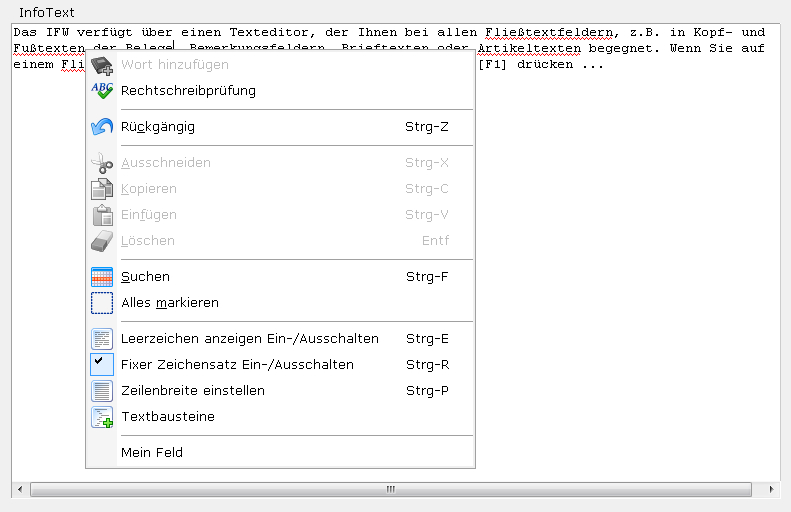 Das IFW verfügt über einen Texteditor, der Ihnen bei allen Fließtextfeldern, z.B. in Kopf- und Fußtexten der Belege, Bemerkungsfeldern, Brieftexten oder Artikeltexten begegnet. Wenn Sie auf einem Fließtextfeld anfangen zu schreiben, oder die Taste F1 drücken, öffnet sich der Editor.