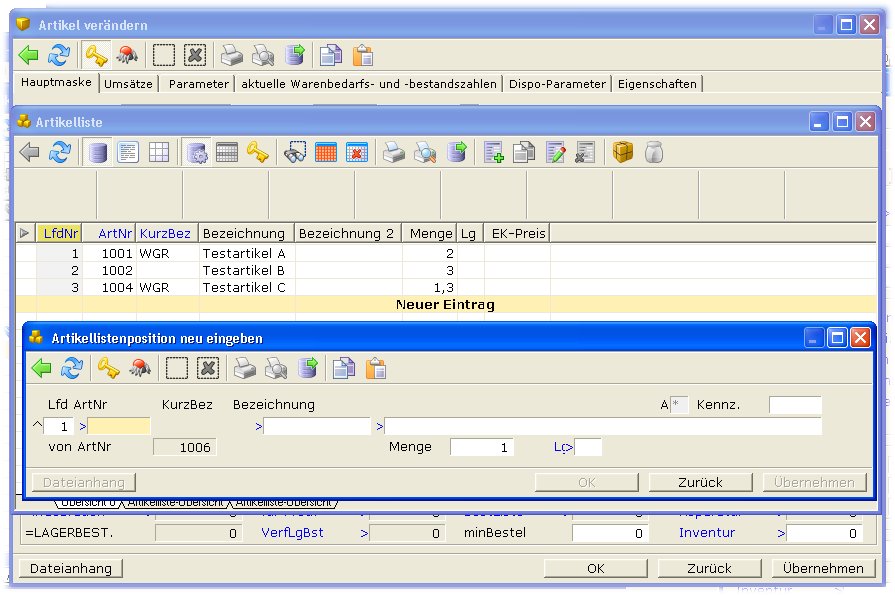 Um festzustellen, ob ein Artikel in Listen eingesetzt ist, drücken Sie im Artikelstamm die Taste F10. Wählen Sie dann den Menüpunkt in welchem Listenartikel. Es erscheint eine Liste, in der die entsprechenden Fertigprodukte aufgelistet sind. Sie können dann wie gewohnt mit der Taste F1 oder F9 weitere Informationen abfragen.