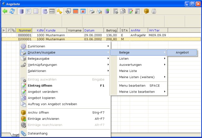 Klicken Sie in der Auswahlliste auf einer Zeile mit der rechten Maustaste. Es öffnet sich das Druck- und Funktionsmenü. Das Menü ist kontextsensitiv, d.h. das Menü kann je nach Belegart unterschiedlich sein.