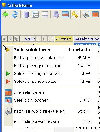 Ein Rechtsklick in dieser Spalte öffnet das Selektionsmenü.