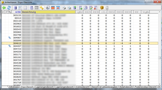 Ausschnitt der Artikelstamm Dispoübersicht