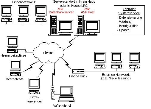 Möchten Sie die Anschaffung umfangreicher Hardware vermeiden und Ihren Pflegeaufwand für Ihre EDV Anlage verringern, bieten wir den IFW Hostingsservice. Dabei steht der IFW Datenbankserver mit Ihren ganzen IFW Daten in unserem Haus. Sie arbeiten stets über das Internet auf diesem Server. Alle Arbeiten zur Pflege und Sicherheit des Servers und Ihrer IFW Installation wird von uns übernommen. Die modernen kostengünstigen Internetzugänge machen die Zugangskosten überschaubar.