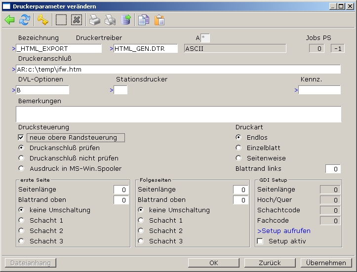 Alle Ausdrucke werden auf der Host-Seite erstellt und ausgegeben. Mit den folgenden Einstellungen können die Ausdrucke auf den Client umgeleitet werden. Remotedruck: "RE:" Die Druck-/Dateiausgabe erfolgt immer auf der Client-Seite. Dies ist für Druckertypen notwendig, die nur auf dem Client existieren, oder wenn in eine Datei gedruckt werden soll. Autoremote: "AR:" (empfohlen) Wird dieser Parameter vorangestellt, unterscheidet das IFW automatisch ob man über den Client eingeloggt ist, oder direkt am Host arbeitet. Die Ausdrucke werden demgemäß automatisch an den Client geleitet oder am Host ausgegeben. Beispiel für die HTML-Druckvorschau: