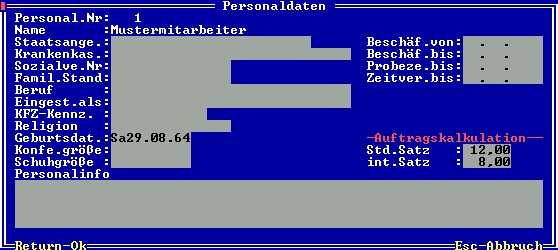 Die Stundensätze für die Nachkalkulation werden im Personalstamm vorgegeben (Menüpunkt Prod/Betrieb|Personalverwaltung|Personalstamm). Betätigen Sie in der Personalmaske die Taste Strg-F3 (Rechte notwendig) und betätigen Sie auf dem Feld ">Personaldaten (F1)" die F1 Taste. Sie erhalten die Untermaske "Personaldaten":
