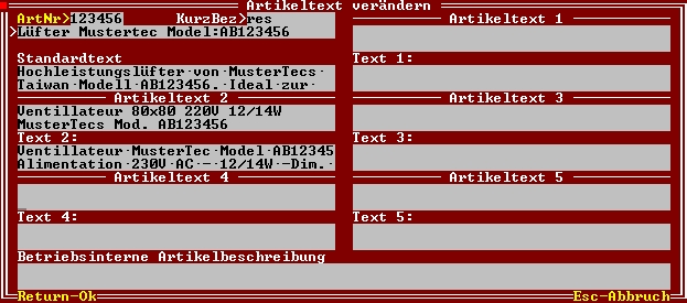 Füllen Sie die Artikeltextmaske für jeden Artikel entsprechend aus. Die Artikeltexte erreichen Sie mit F1 auf dem Feld "Texte>" in der Artikelmaske, oder über den Menüpunkt "Prod/Betrieb| Artikelverwaltung| Artikeltextübersicht". Legen Sie fest in welchem Feld die englischen, die französischen und die spanischen Texte stehen sollen und halten Sie die Regel für alle Artikel ein.