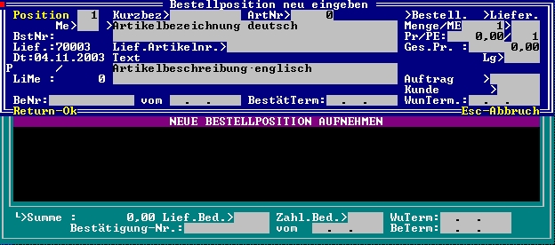 Auf den Belegen (hier z.B. Bestellung) erscheint das Feld "Textschl.>". Es wird beim Abrufen eines Lieferanten automatisch mit dem Inhalt des Feldes "Artikeltext" aus der Lieferantenmaske bestückt.