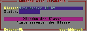 Klasse: Tragen Sie hier den Namen der Klasse ein. Er ist der Primärschlüssel der Datenbank und kann daher nicht nachträglich geändert werden. Status: Das Statusfeld dient der Klassenverwaltung und steht zur freien Verfügung. Tragen Sie einzelne Zeichen (Buchstaben und Zahlen) ein um verschiedene Zustände zu führen. Sie können auf diesem Feld auch eine Auswahlliste für Ihre Kennzeichen erstellen (Tastenkombination Alt+F10). Verwenden Sie es um z.B. bedeutungslos gewordene Klassen zu markieren. >Kunden der Klasse Drücken Sie auf diesem Feld F1, um eine Liste aller zugeordneter Kunden einzusehen. >Interessenten der Klasse Drücken Sie auf diesem Feld F1, um eine Liste aller zugeordneter Interessenten einzusehen.