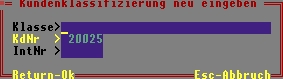 Diese Masken können Sie mit F1 von der Kundenmaske (Feld KL>) oder ausgehend von der Interessentenmaske (Feld >Klassenzuordnung) aufrufen. Sie ordnen darüber dem Kunde ein oder mehrere Klassen zu. Klasse> Drücken Sie F1 um eine Klasse auszuwählen. KdNr> IntNr> Die Felder werden automatisch mit der Kundennummer bzw. Interessentennummer ausgefüllt. Verändern Sie sie nicht.