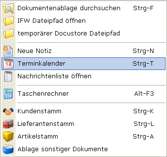 Drücken Sie die Tastenkombination Strg+T. Sie können so auch während Sie einen Beleg bearbeiten den Terminkalender öffnen.