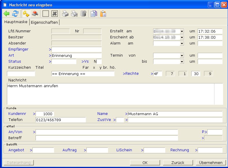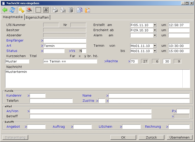 - Neue Nachricht anlegen Strg-N Erzeugt die Maske zur Eingabe einer Nachricht und/oder eines Termins. Diesen Menüpunkt können Sie auch jederzeit mit der Tastenkombination Strg+N ausführen.