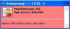 Die Nachricht bekommt die Überschrift "Erinnerung". Die Hintergrundfarbe der Nachricht ist dunkelrot, die Schrift weiß. Die Nachricht erscheint sofort, da das Erscheinungsdatum das Erstellungsdatum ist (E+D=0). Wenn ein Termin eingetragen wird, so erscheint die Nachricht auch sofort auf dem Desktop, da das Erscheinungsdatum das Termindatum ist (E+T=0). Ohne Termin gibt es keinen Alarm (A+D="-"). Falls ein Termin eingetragen ist, so wird 1 Tag nach Überschreiten des Termins die Nachricht blinkend dargestellt (A+T=1).