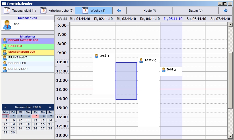 Öffnen Sie zuerst die Terminübersicht (Strg+T). In der Terminübericht ist am linken Rand die Liste der IFW Benutzer. Klicken Sie auf den Benutzer dessen Termine Sie sehen wollen. Zeigen Sie mit der Maus auf den Termin, halten Sie die linke Maustasste gedrückt und verschieben Sie ihn an die gewünschte Stelle. Sobald Sie die Maustaste loslassen erscheint eine Systemmeldung, die sie mit "OK" bestätigen.