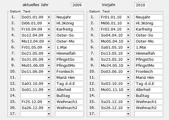 Füllen Sie zumindest die Spalte des aktuellen Jahres aus. Beim Jahreswechsel können Sie die Angaben der Spalte aktuelles Jahr in die Spalte Vorjahre übertragen, wodurch im Terminkalender auch die Feiertage des letzten Jahres noch korrekt angezeigt werden.