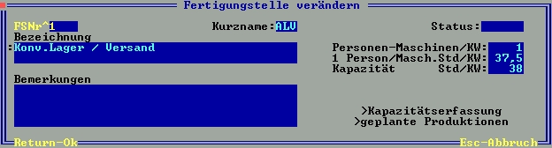 Bezeichnung: Vergeben Sie in der ersten Zeile die Bezeichnung der Fertigungsstelle. Sie wird bei diversen Ausdrucken verwendet.