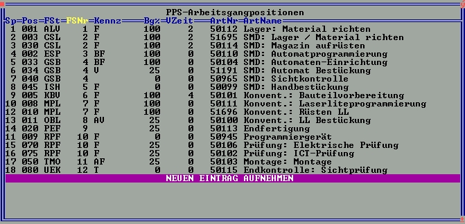 - Arbeitsgangliste zur Vorgabe der einzusetzenden Arbeitsgänge in einer Produktion. Die Arbeitsgänge sind jeweils mit einer Fertigungsstelle gekoppelt. So können mehrere Arbeitsgänge gebildet werden, die alle die gleiche Fertigungsstelle belasten (z.B. SMD Einrichtung, SMD Bestückung, SMD Sichtkontrolle).