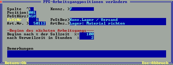 Beginn nach % der Sollzeit %: Wann der nächste Arbeitsgang beginnt, kann mit diesem Wert angegeben werden. Soll er erst nach Abschluss der gesamten Arbeit dieses Arbeitsgangs beginnen, so tragen sie hier 100 ein (ein typische Wert). Soll er Zeitgleich mit diesem Arbeitsgang beginnen, so tragen sie hier 0 ein. Soll er nach Abschluss von 25% der Arbeit dieses Arbeitsgangs beginnen, tragen sie 25 ein.