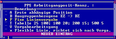 F Fixe Linienvorgabe. Fixe Arbeitsgänge verändern ihre Anzahl zugeordneten Ressourcen (z.B. Personen die an diesem Arbeitsgang beteiligt sind) nicht automatisch. Sie können vom Anwender in der Produktionsplanung individuell eingestellt werden.