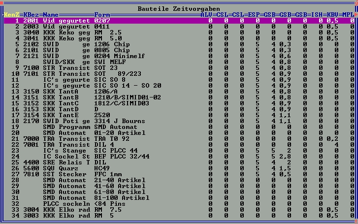 Beispiel einer Bauteilezeittabelle in einem Bestückungsbetrieb für Leiterplatten: