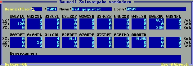 Die Zeittabelle ist hier nach Kennziffer sortiert aufgelistet. Im Artikelstamm kann im Feld "PPS Bauteil-Zeitvorgabe" ein Eintrag über die Kennziffer zugeordnet werden. Das Feld ist in der Artikelmaske unter ">EinkPara" mit der Taste F1 erreichbar.