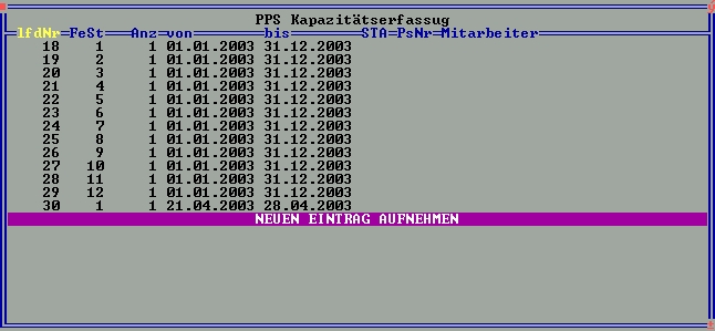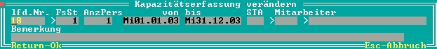 >Kapazitätserfassung: Hier können Sie mit der Taste F1 die Liste der verfügbaren Personen/Maschinen in einem Zeitraum sehen und bearbeiten. Beim eingegebenen Intervall gelten immer nur ganze Wochen. Die Kapazität errechnet sich aus der Anzahl in einer Woche mal den Stunden pro Woche aus dem Feld "1 Person/Masch.Std/KW". Geben Sie für eine Person für das ganze Jahr Anzahl 1 von 01.01 bis 31.12 ein.