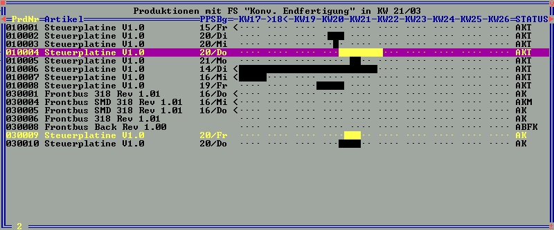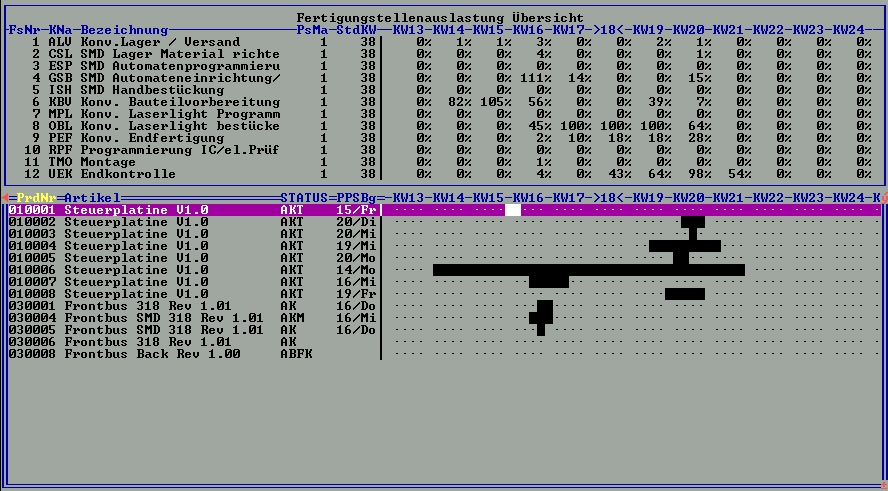 - Balkenanzeige über die zeitliche Lage der geplanten Produktionen mit gleichzeitiger Anzeige der Auslastung der Fertigungsstellen..
