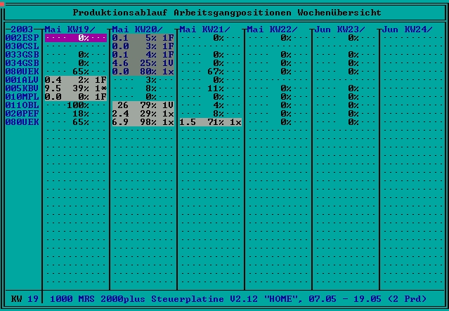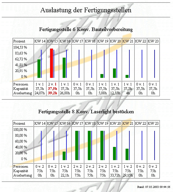 - Ausweisung der Auslastung der Fertigungsstellen Wochenweise in Prozent, Stunden und Personen.