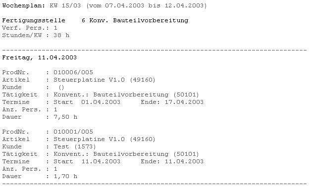 Beispiel der Ausgabe eines Tages des Arbeitsplans einer Fertigungsstelle:
