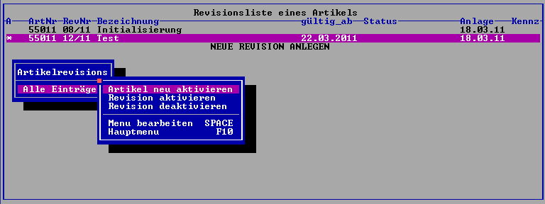 Mit F10 können Funktionen zur Bearbeitung der Revisionsliste aufgerufen werden. Bewegen Sie dazu den Auswahlbalken auf die betroffenen Revisionszeile und drücken Sie F10.