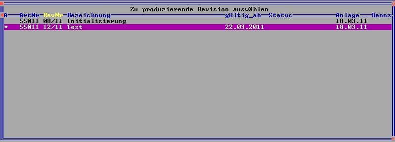 - Sobald im Feld Rev> im Artikelstamm eine Revisiosnnummer enthalten ist, wird bei der Produktionsanlage der zu verwendente Revisionsstand abgefragt. Die aktuell aktive Revision ist mit dem Zeichen '*' in der Zeile gekennzeichnet.