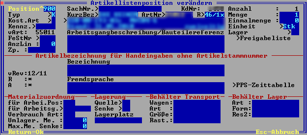 - Rev> Revisionsnummer der aktiven Revision. Mit F1 kann die Liste der Revisionsstände des Artikles abgerufen werden. Hier wernden auch die Stücklisten der verschiednen Revisionsn bearbeitet.