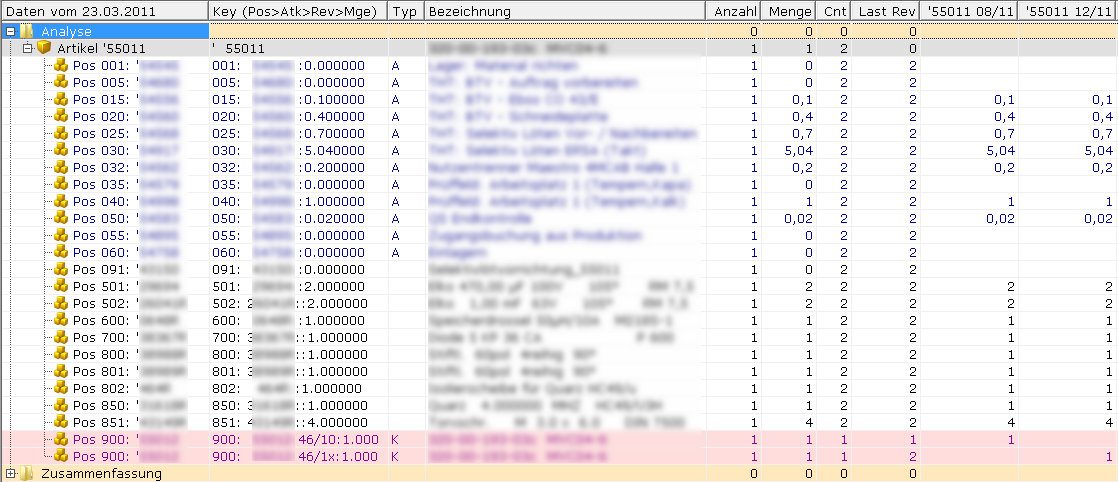 - Im Artikelstamm kann auf einem Produkt mit F4 das Formular "Revisionsvergleich von Artikel" aufgerufen werden. Es zeigt einen Vergleich der Positionen der verschiedenen Revisionsständen an. In den letzten Spalten sind horizontal die Revisionsmengen der Revisionsstände angeben, vertikal die Positionen.