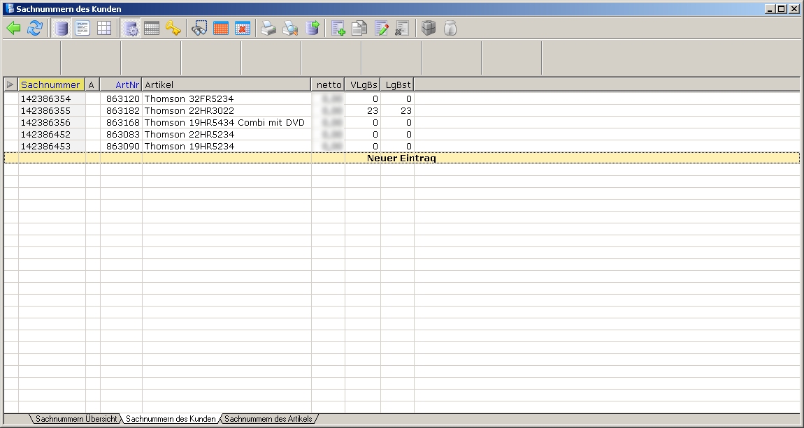 - KdNr die Kundennummer, zu der die Sachnummer erfasst wird. Drücken Sie F1 um aus dem Kundenstamm auszuwählen.