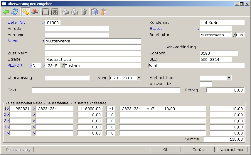 Fünf Zeilen im Fußbereich der Überweisung sind für die Aufnahme der einzelnen Verbindlichkeiten vorgesehen. Diese Felder werden bei der Auswahl über F1 auf den Feldern Beleg bzw. Rechnung automatisch ausgefüllt, und können anschließend angepasst werden.