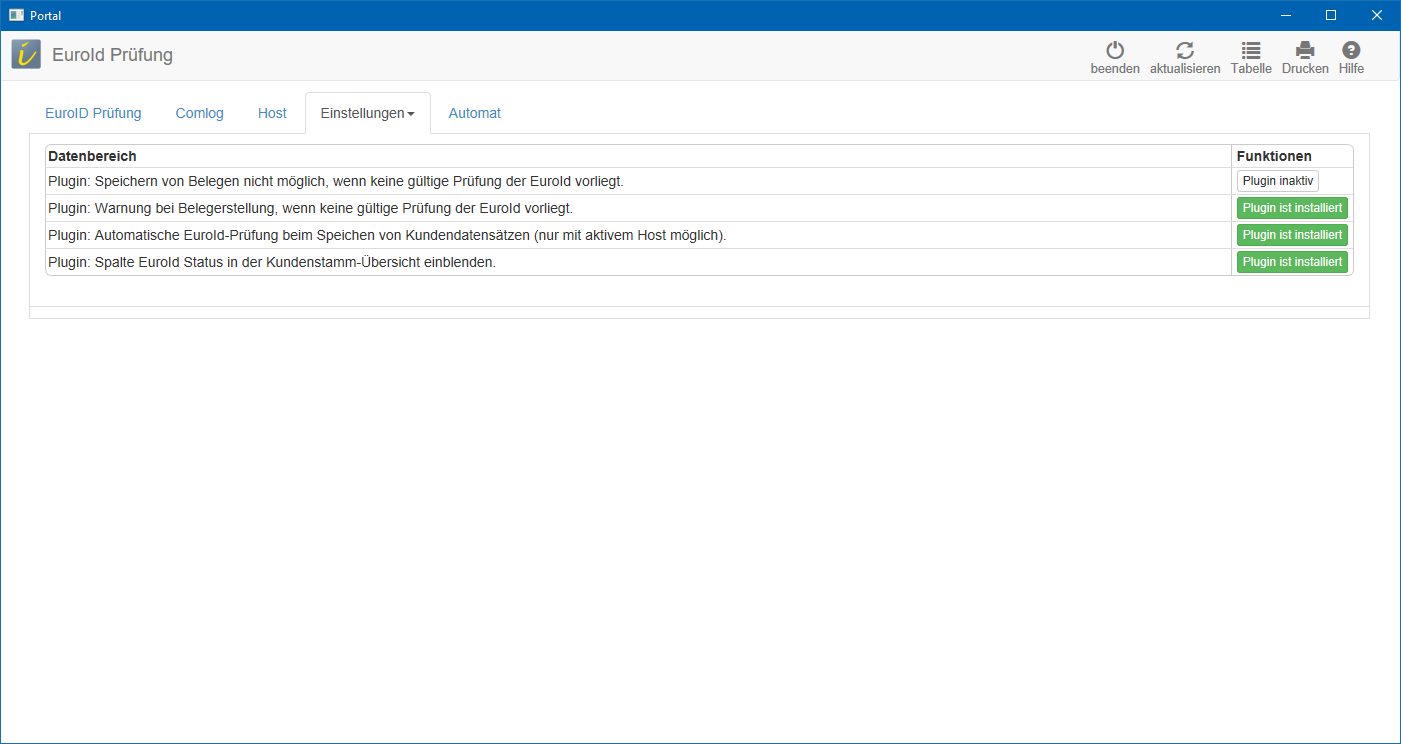 Über den Host erfolgt die EuroID Prüfung beim Speichern von Kundensätzen. Dazu müssen unter Einstellungen die Gateway Einstellungen getroffen sein und das Plugin Automatische EuroId-Prüfung, beim Speichen von Kundensätzen aktiviert sein.